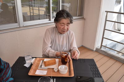 テラス席でホットコーヒーとシフォンケーキをご注文された、お客様です。