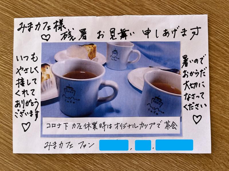 みまカフェスタッフに「明るく、元気に!がんばってください。」と応援メッセージをくださりました。