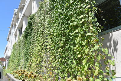 テラス前に並んだプランターのミニひまわりが元気に咲きました!