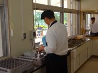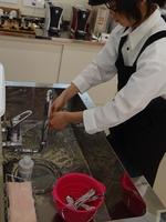3年生スタッフがご来店のお客様の人数を確認して、水を入れてます。