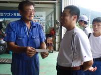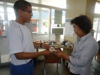 レジ係の生徒は、小さなお客様の目線に合わせるように、大きな体をかがめて対応しています。