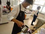 カフェにお客様体験に来た1年生がコーヒーのいれかたを見学してます。