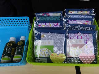 今回は、生徒が作成した『あづま袋』とお茶をお配りさせていただきました。